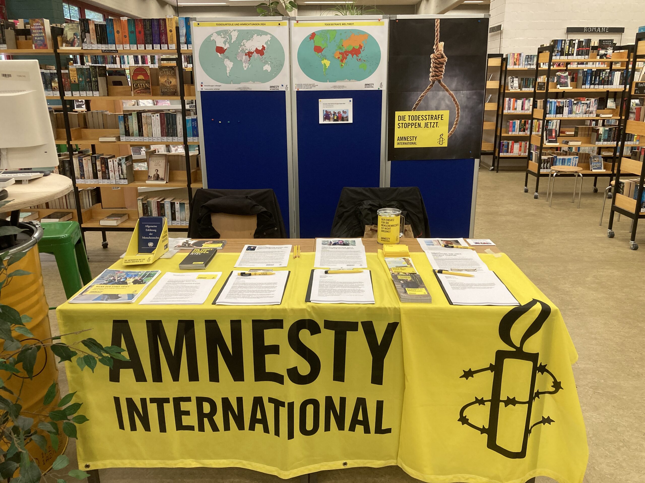 - Zum Internationalen Tag gegen die Todesstrafe haben wir am 10.10.2024 in der Stadtteilbibliothek Essen-Überruhr über die Todesstrafe informiert. Es wurden Briefe für die von der Hinrichtung bedrohten Frauen Pakhshan Azizi und Sharifeh Mohammadi aus dem Iran unterschrieben sowie für die Abschaffung der Todesstrafe in Gambia, Kenia und Simbabwe.